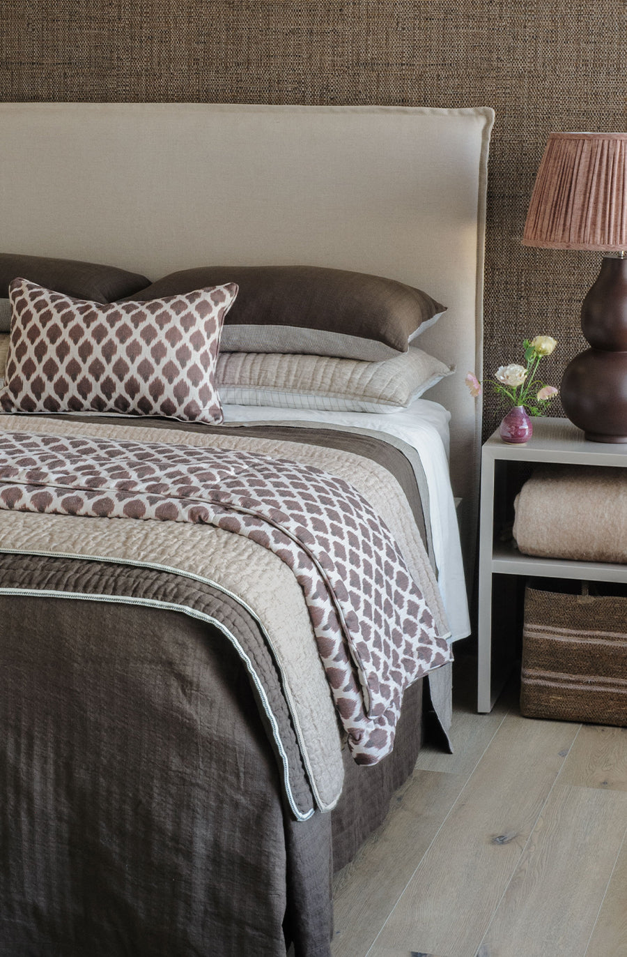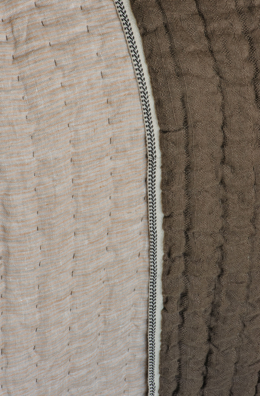 Crafted from premium, subtly textured dobby weave cocoa linen, this coverlet enchants the senses in its warmth and decadence. With hand-quilted lines adding depth and structure, the reversible Appetto cocoa coverlet is trimmed with a black and ivory woven ribbon to further enrich its texture. On the reverse, a driftwood linen offers a soothing contrast of muted woody tones, dancing in subtle stripes.