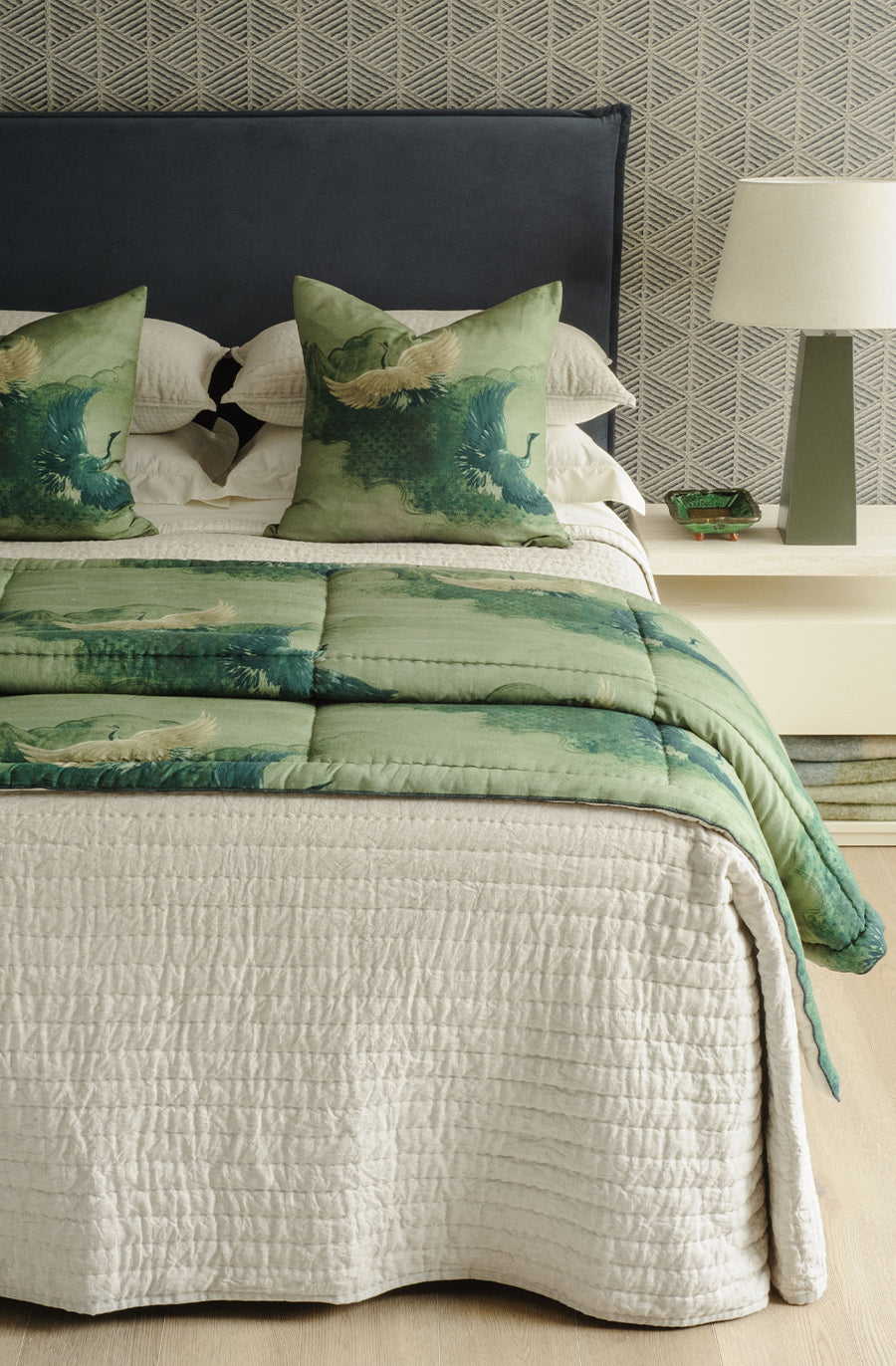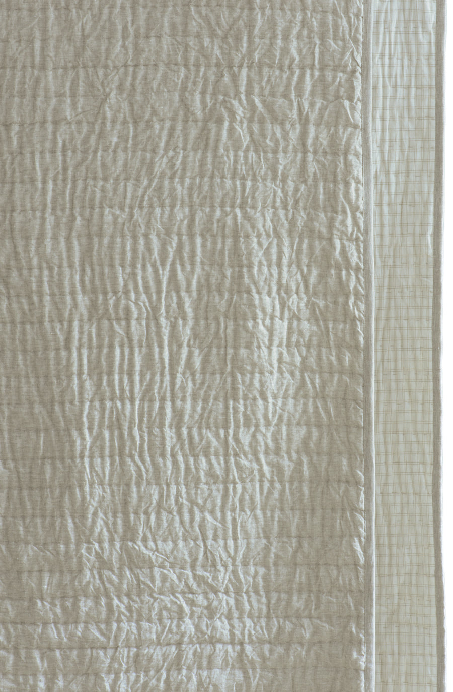 The horizontal hand-quilted lines stitched across this reversible bedspread are a direct representation of the thoughtful relationship between artisan and material, carefully threaded through an oatmeal foundation of soft-washed linen chambray. Focused with restrained colour and unified with an ivory and oatmeal small cotton check reverse, Misaka oatmeal can stand alone in classical simplicity or become the perfect base for coloured accents.