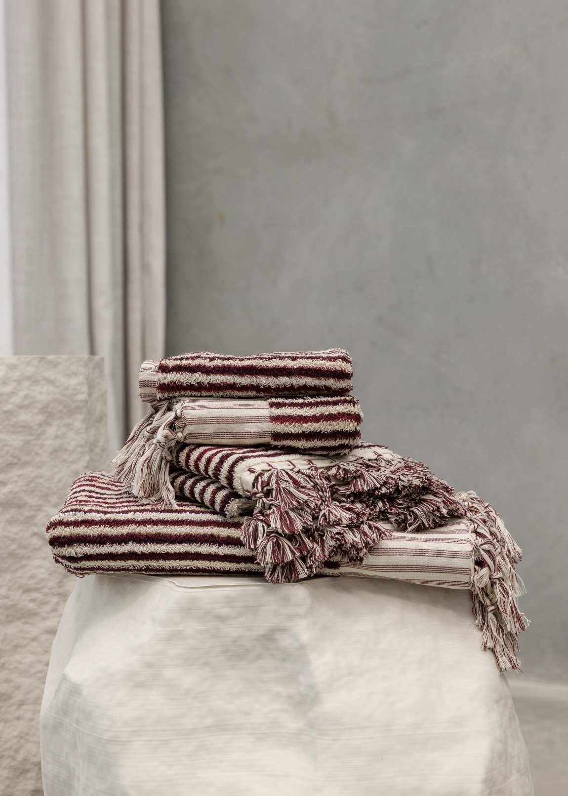 The Burgundy Stripe Bath Towel is a timeless stripe crafted with a mix of three rich burgundy threads and neutral ecru cotton. Tied with traditional Turkish tassels the densely woven, silky soft, organic cotton fibres feel blissfully indulgent and will complement any design aesthetic in the home.
