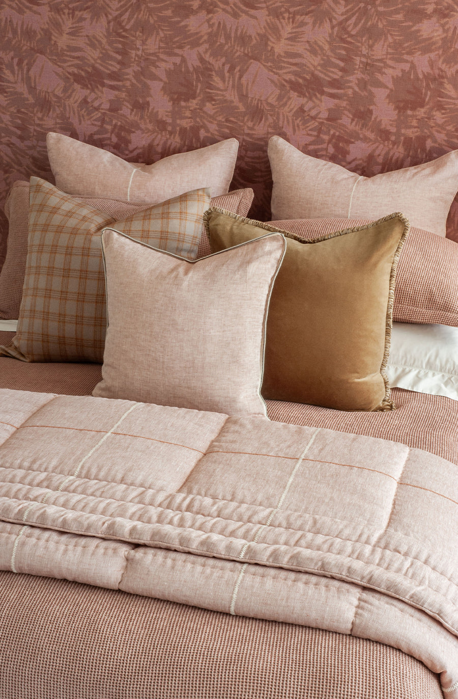An intricately woven linen fabric radiates comfort and warmth through interlocking threads of nutmeg, cinnamon and cocoa across the front of this reversible cushion. Trimmed with a black and ivory woven ribbon and reversing to a soft pink clay linen chambray, the Appetto nutmeg cushion boasts soft contrasts and tailored details for your lounge or bedroom.