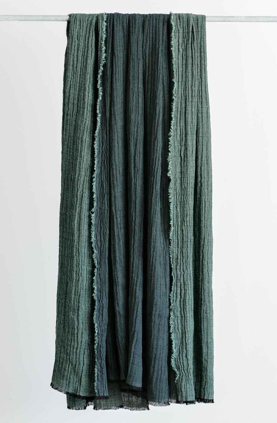 The ultimate lightweight blanket for balmy summer nights, Leggera is a double-layered, floaty gauze fabric made from a mix of linen and cotton. The crinkled, soft-washed finish with frayed edges brings a casual, relaxed aesthetic to any room. Alternatively if ironed smooth can provide a more tailored look. This generous blanket is reversible with a mallard top and an ocean underside.